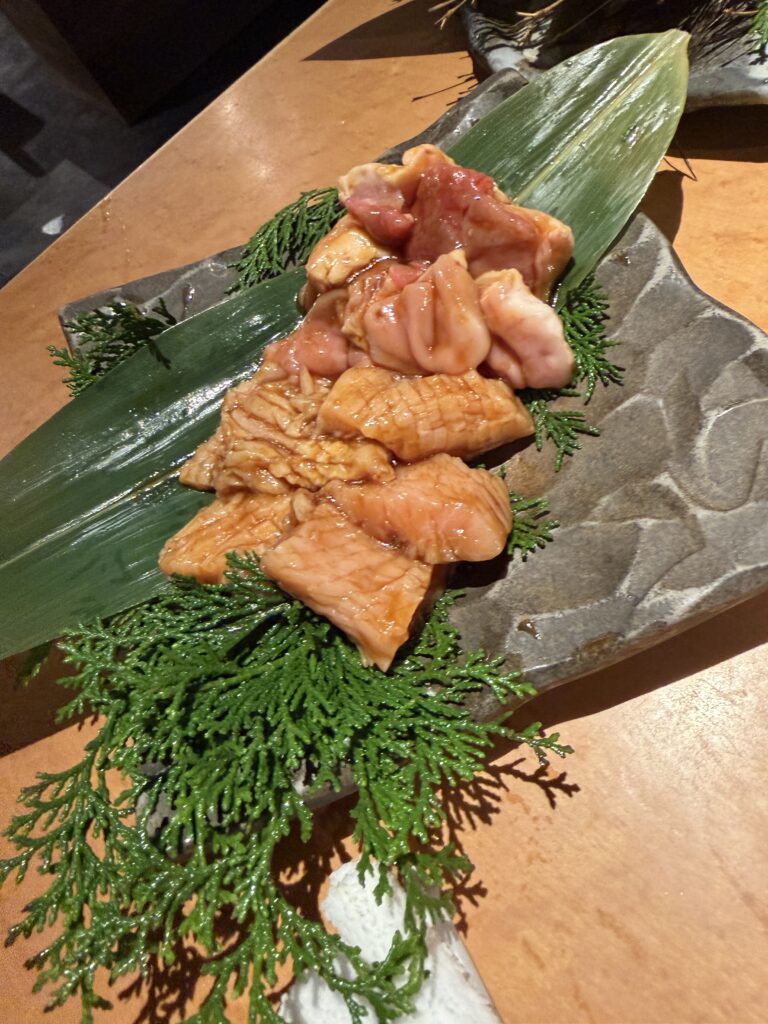 左から、カルビ、ロース、おかわりハラミ、ミノ、赤セン、トラボールです。